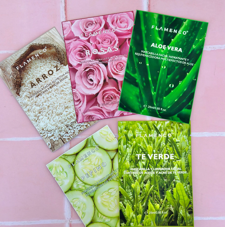 Caja de 10pcs de mascarillas faciales Flamenco de variedad arroz, rosas, aloe vera, pepino y te verde