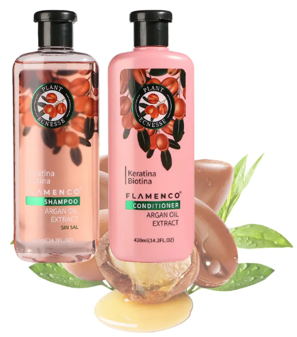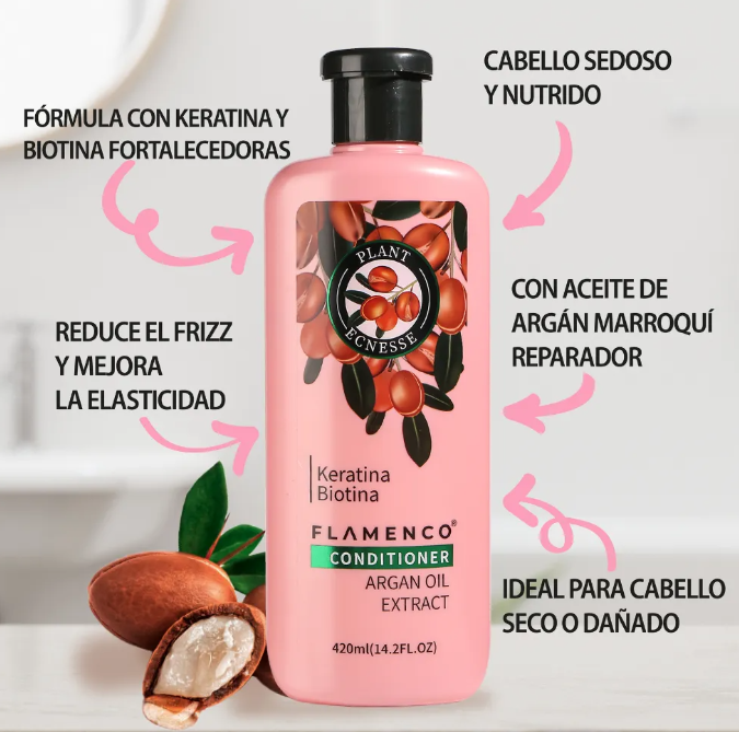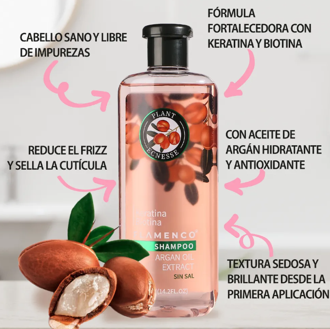 Shampoo + Acondicionador Anti Frizz de Flamenco, tu cabello recibirá el cuidado que merece. Esta fórmula enriquecida con aceite de argán, queratina y biotina transforma tu rutina capilar en una experiencia de hidratación profunda, brillo deslumbrante y suavidad excepcional. Diseñada para todo tipo de cabello, incluyendo los teñidos, logra combatir el frizz y fortalecer cada hebra.