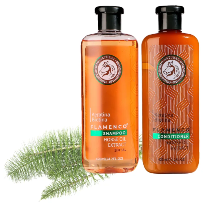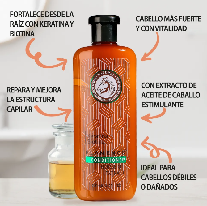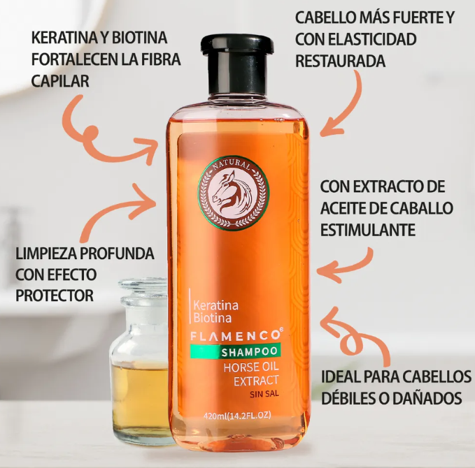 Shampoo + Acondicionador de aceite de Caballo de la marca Flamenco es la solución perfecta para quienes buscan un cuidado integral para su cabello. Su fórmula enriquecida con keratina y biotina proporciona hidratación profunda, brillo duradero y suavidad, convirtiendo tu rutina de cuidado capilar en una experiencia rejuvenecedora. Ideal para todo tipo de cabello, incluidos los teñidos, este producto es hipoalergénico y dermatológicamente testeado, lo que lo convierte en una opción segura y confiable para el uso diario.